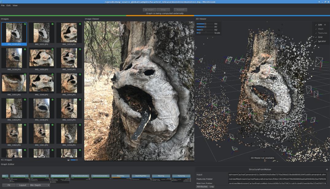 - Meshroom was used to create an initial model out of the 106 photos I took. I learned important facts about photogrammetry through this part of the process. I learned the requirements for good photos to the software and how to utilize the software for better results. The most important thing I learned was to take as many photos as possible at the same focal length with my camera from all around and to take photos from far away as a sort of “reference”. The software loved these to understand how features related to each other in space.