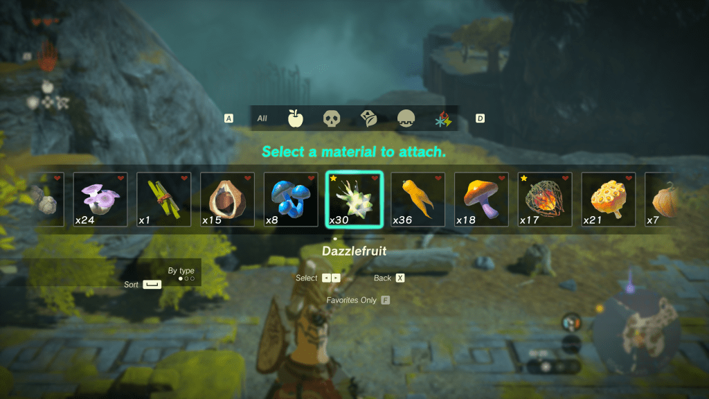 Before starting to change existing design choices, I want to consider more deeply why I don’t think the menu is satisfactory as is. I stated that I thought the lack of options to sort through the inventory or look at a subsection makes it difficult to find new or interesting objects to attach. Looking beyond the default method, TotK gives three options for organizing: