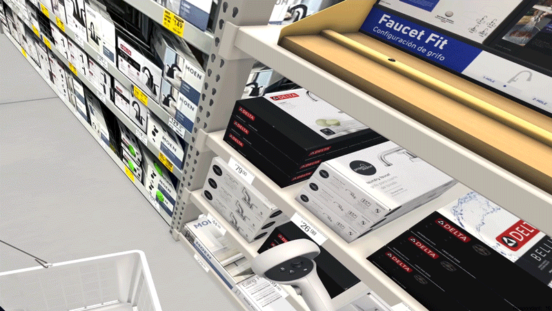In order to conduct research, users can start a new project and populate it with shoppable products from a cloud-based library. By entering the VR headset, users can add gondola sections, arrange shelves, and place sets of products with simple menu-driven search functions.